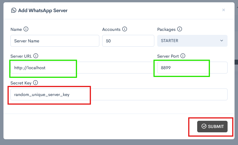 You should copy the exact "Server URL" and "Server Port" from the image because the WhatsApp server is hosted on the same environment. Only change the value of "Secret Key". Make sure that your secret key only contains alpha numeric characters.