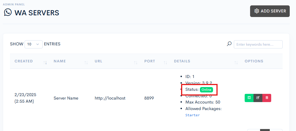 sudo pm2 start ./titansys-whatsapp-linux --name "WA Server" -- --pcode="PURCHASE_CODE" --key="SECRET_KEY" --host="0.0.0.0" --port="8899"pm2 saveAfter doing all the above steps, you should see the WA server online in your Zender admin dashboard: