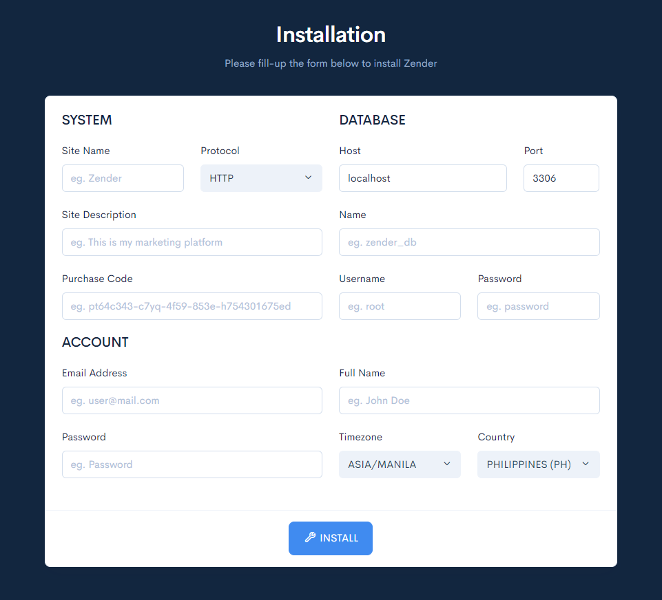 - Enter admin full name, email address, password, select timezone and select country. This account is automatically set as super admin and cannot be deleted from the system.