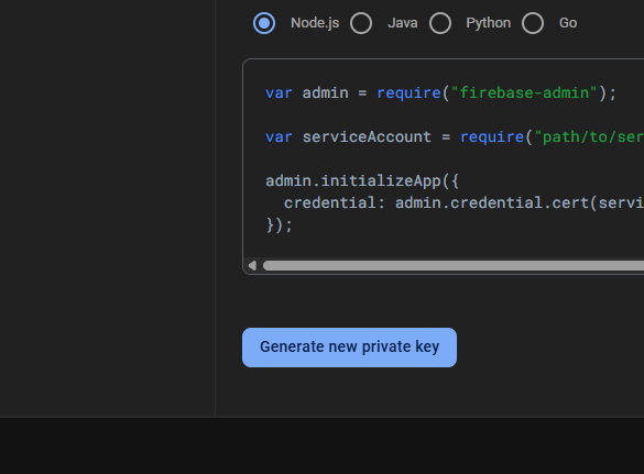 Download your firebase credentials json file by clicking the Generate new private key -> Generate key button