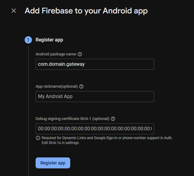 Enter your desired app package name, please use a unique combination, you can use your site domain if needed then click Register app