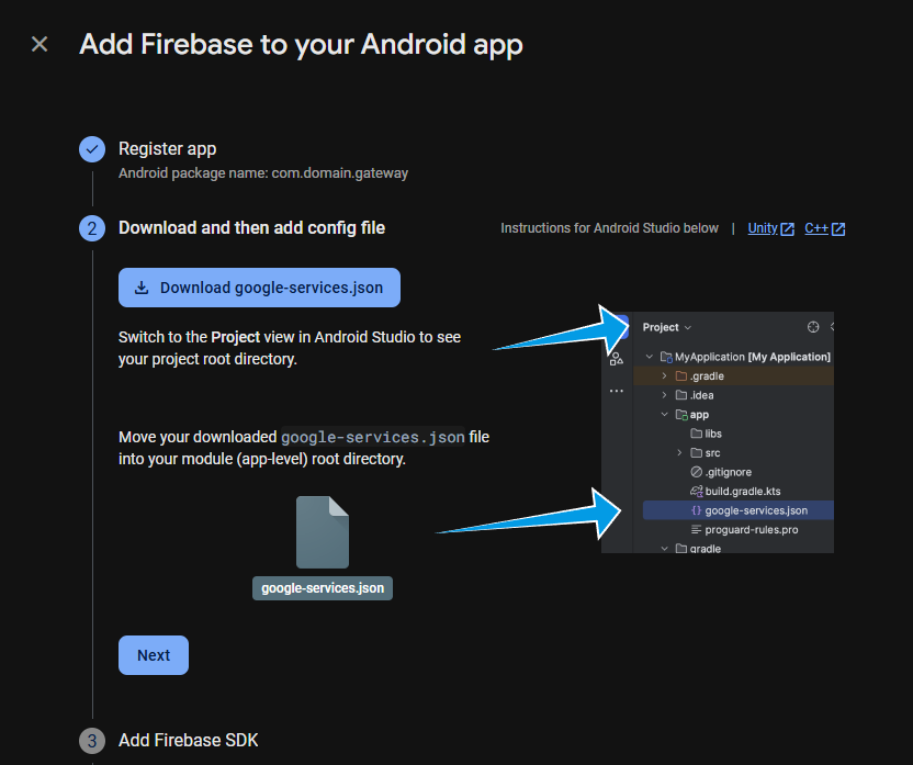 Download the google-services.json file then click Next until the Continue to the console shows up