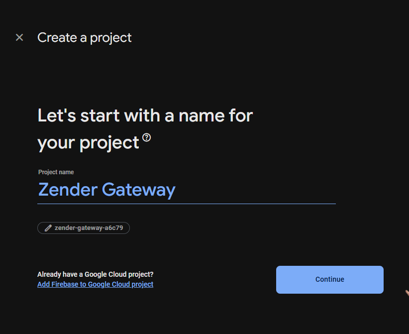 Create a unique project name, tick the box and click Continue